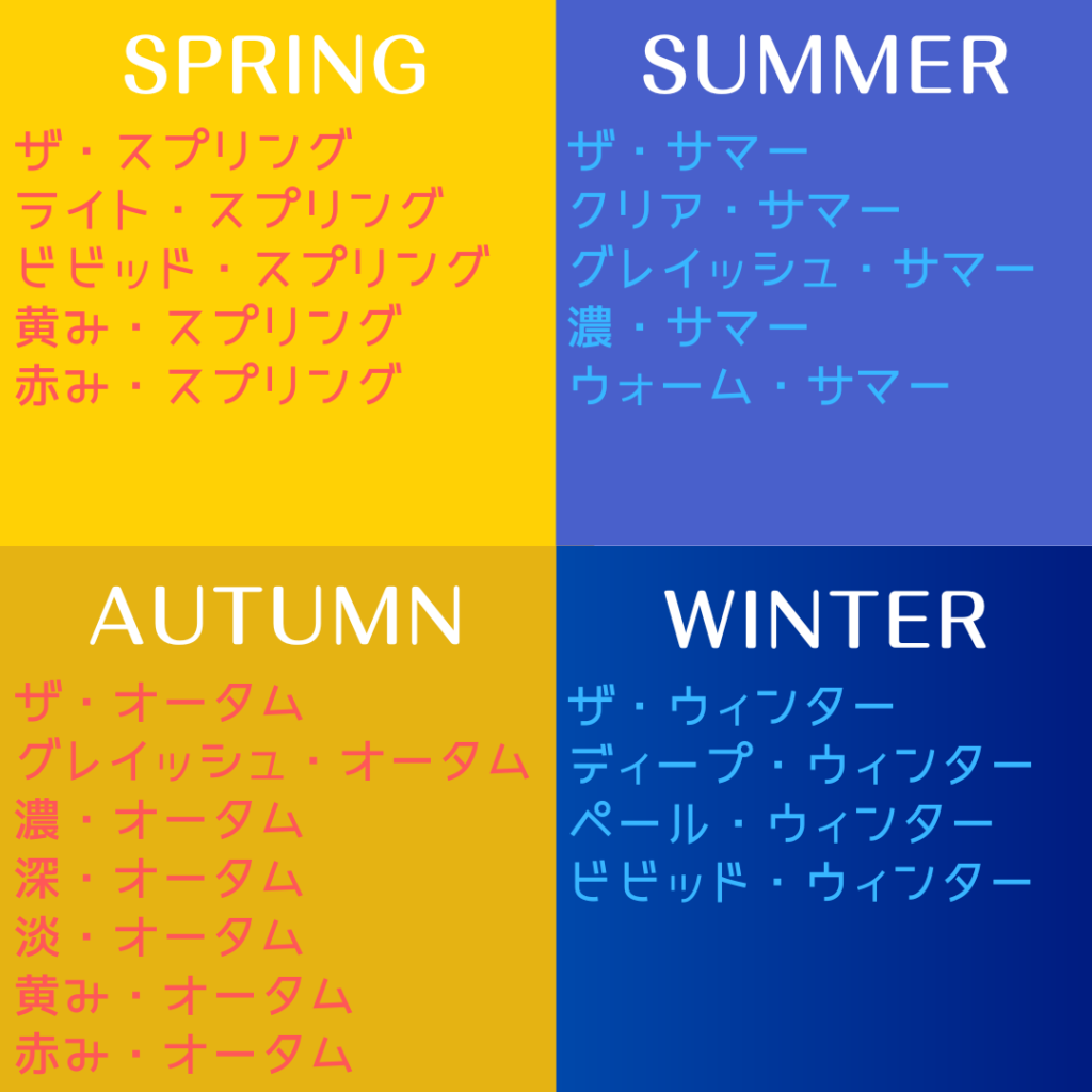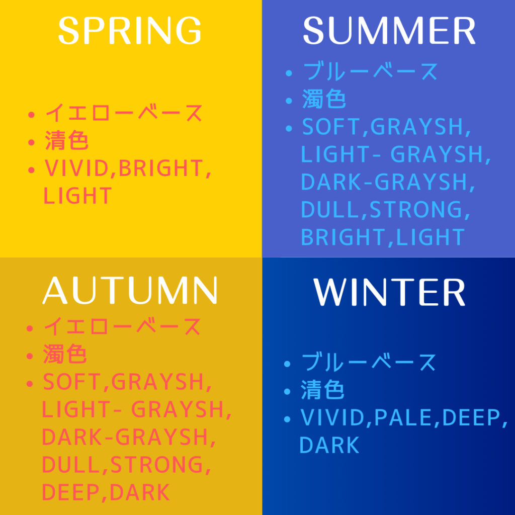 春・夏・秋・冬のもつイメージをイエベ・ブルベとトーン表をかけ合わせて分類したものです。